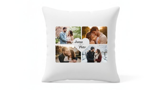 Polštář bílé barvy o velikosti 40x40cm se čtyřmi fotografiemi ve tvaru srdce…